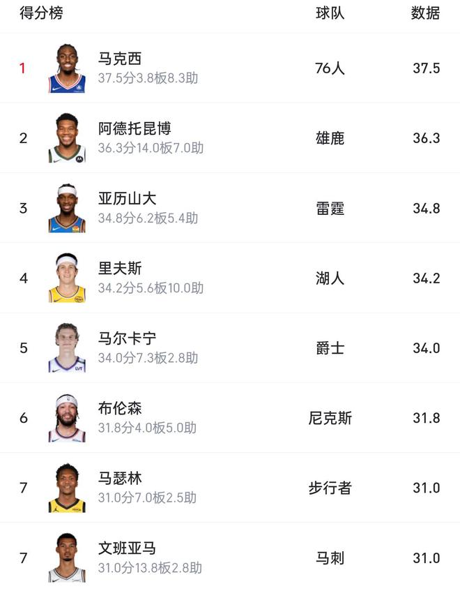 说实话,不看结果很难想象,还有谁能在场均得分上力压字母哥和亚历山大,结果真有。他就是76人的马克西,因为乔治受伤、恩比德下滑,马克西不得不扛起球队进攻大旗,过去4场比赛,他场均上场43分钟,得到37.5分3.8篮板8.5助攻,命中率45.5%,场均命中4.5记三分,三分球命中率47.4%,帮助球队4胜0负。马克西这赛季虽然没拿50+,但已经有了2场40+,对于上面的排名,你认为谁最终能拿下本赛季的得分王呢?